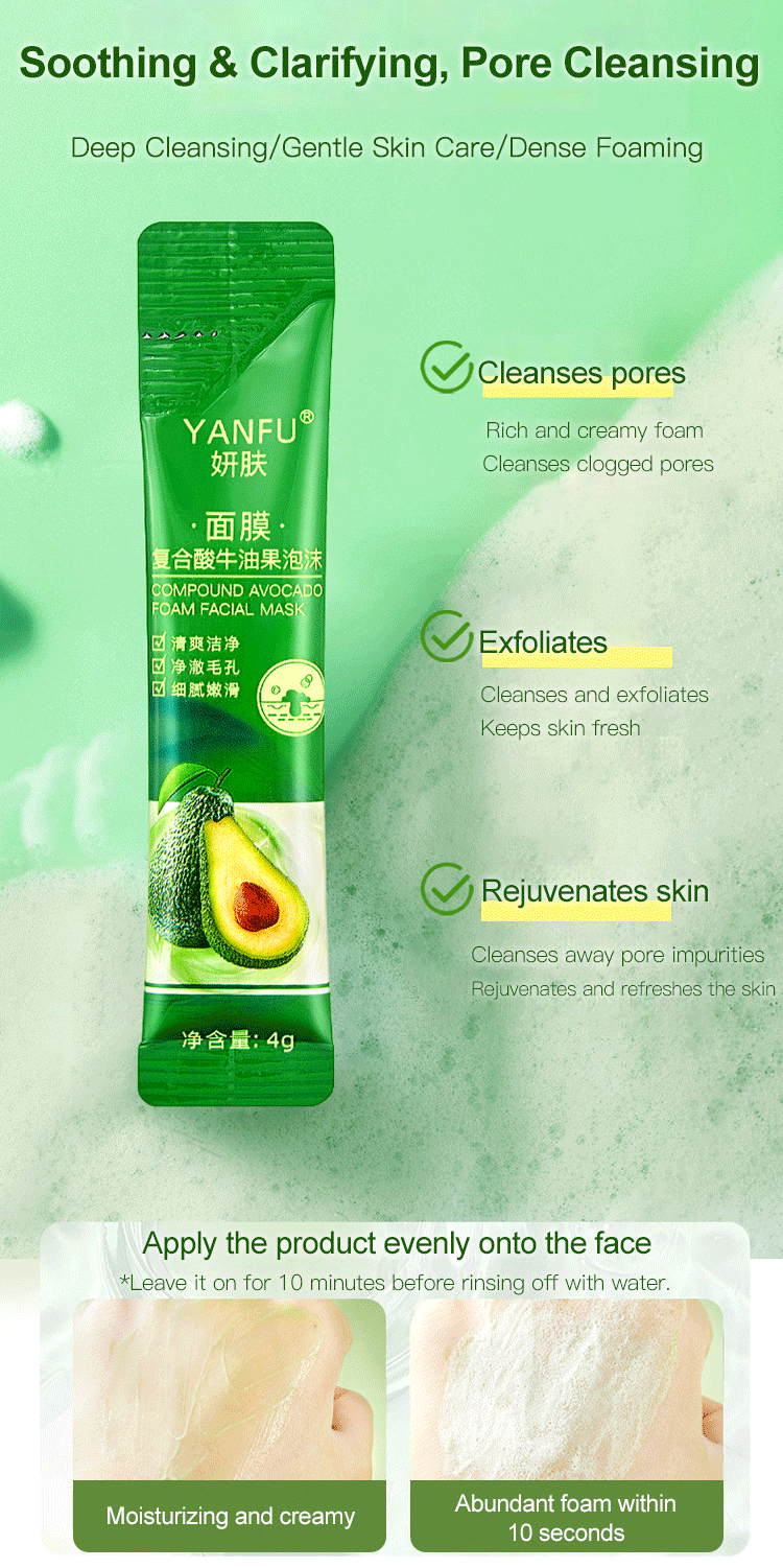 The YANFU Complex Acid Avocado Cleansing Facial Bubble Mask is an advanced skincare solution formulated to effectively penetrate and dissolve dirt layer by layer, providing a thorough and revitalizing cleanse. Infused with the natural potency of green tea and fortified with essential vitamins, this mask works diligently to deeply penetrate the skin, targeting embedded impurities and pollutants.