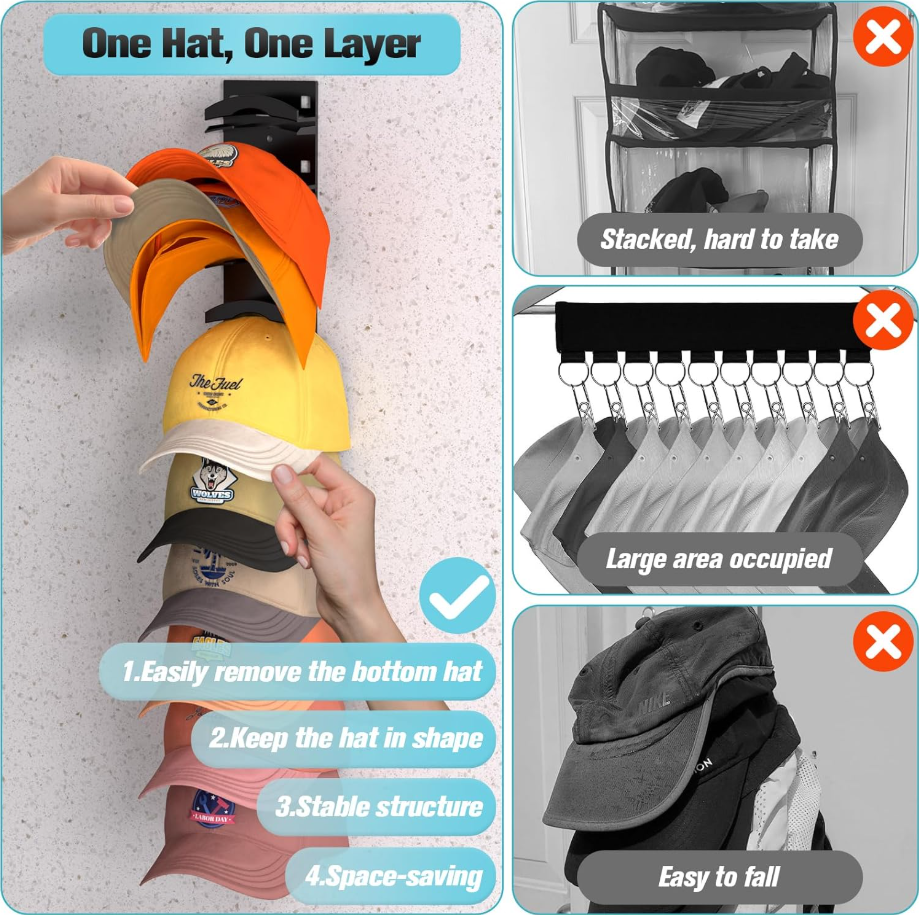 One Hat, One Layer: Hat organizer is designed with one hat and one layer for easyaccess. Unlike hat hooks on the market, it is difficult to remove the bottom layer ofhats. No need to stack layers, even the bottom layer of hats can be easily removed bygently picking up the brim.