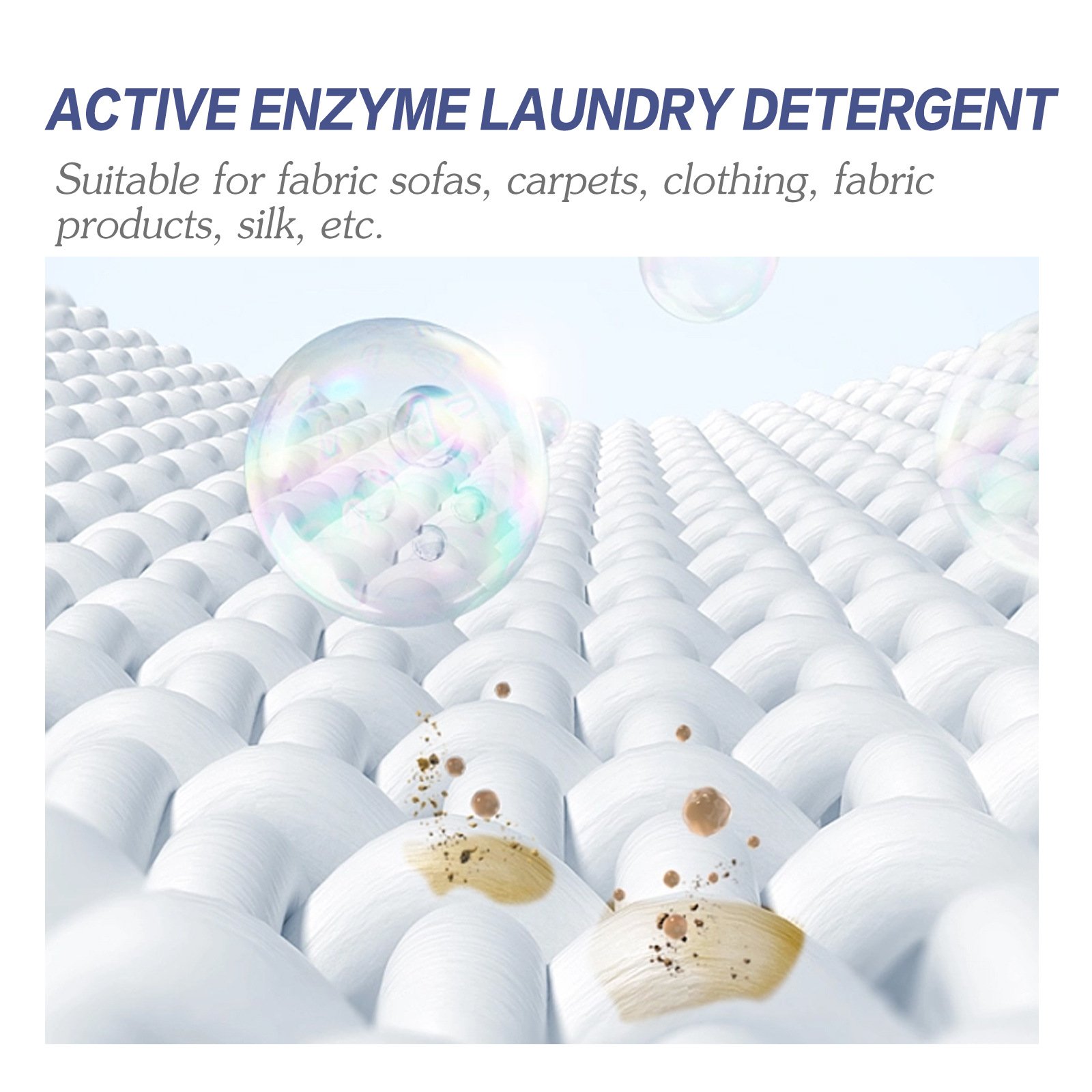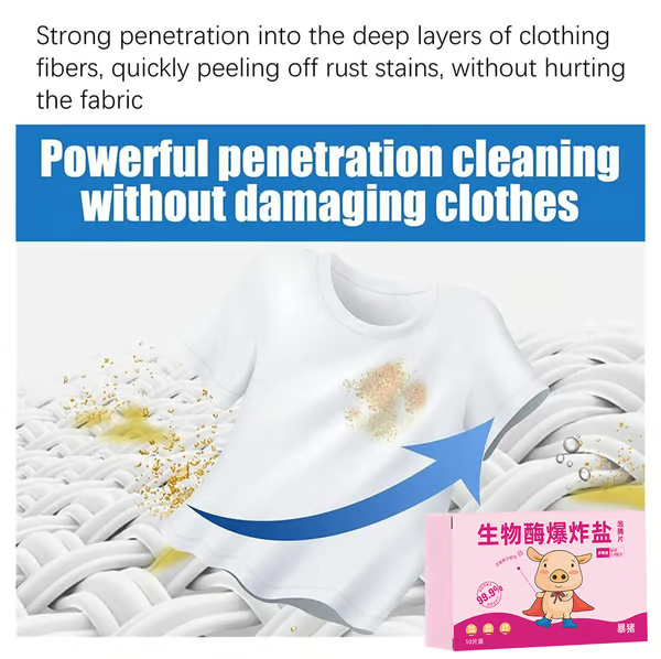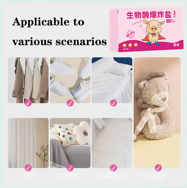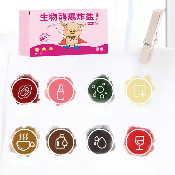 The addition of bioactive enzymes effectively resists dirt deposition and adsorption, can quickly dissolve and generate oxygen bubbles, penetrate deep into fiber gaps, and powerfully break down stubborn stains.