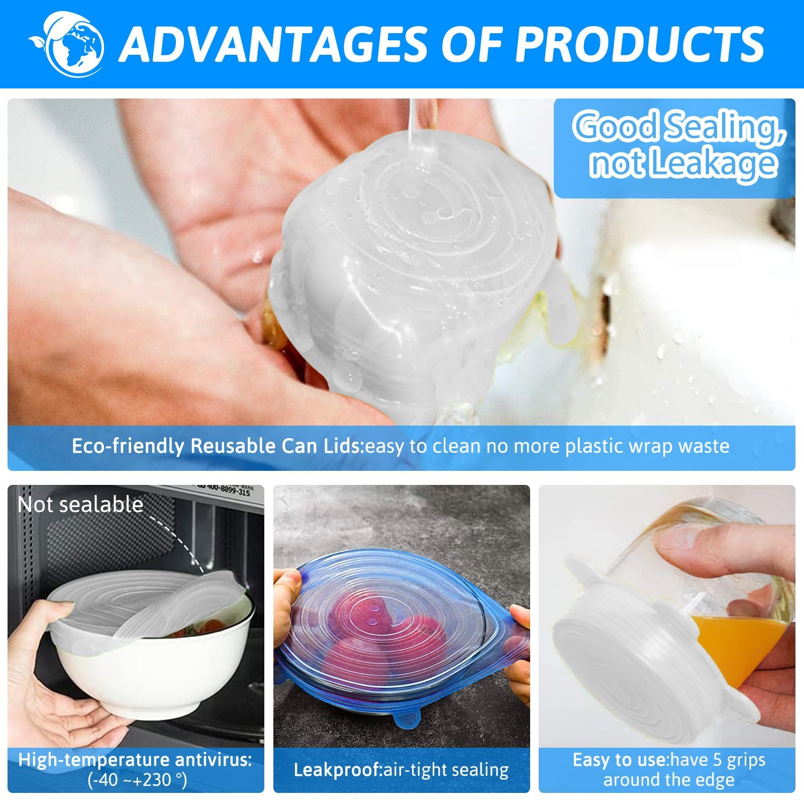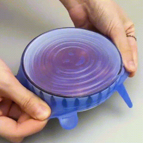 These silicone lids have super flexibility and elasticity, 6 different sizes (2.5in, 3.7in, 4.4in, 5.5in, 6.2in, 7.8in, elasticity can double stretch. Followed on the alien cup, jar, square and round bowl and fruits. Make sure both the lid and container are completely dry before use so that it can form a tight edge around the edges.